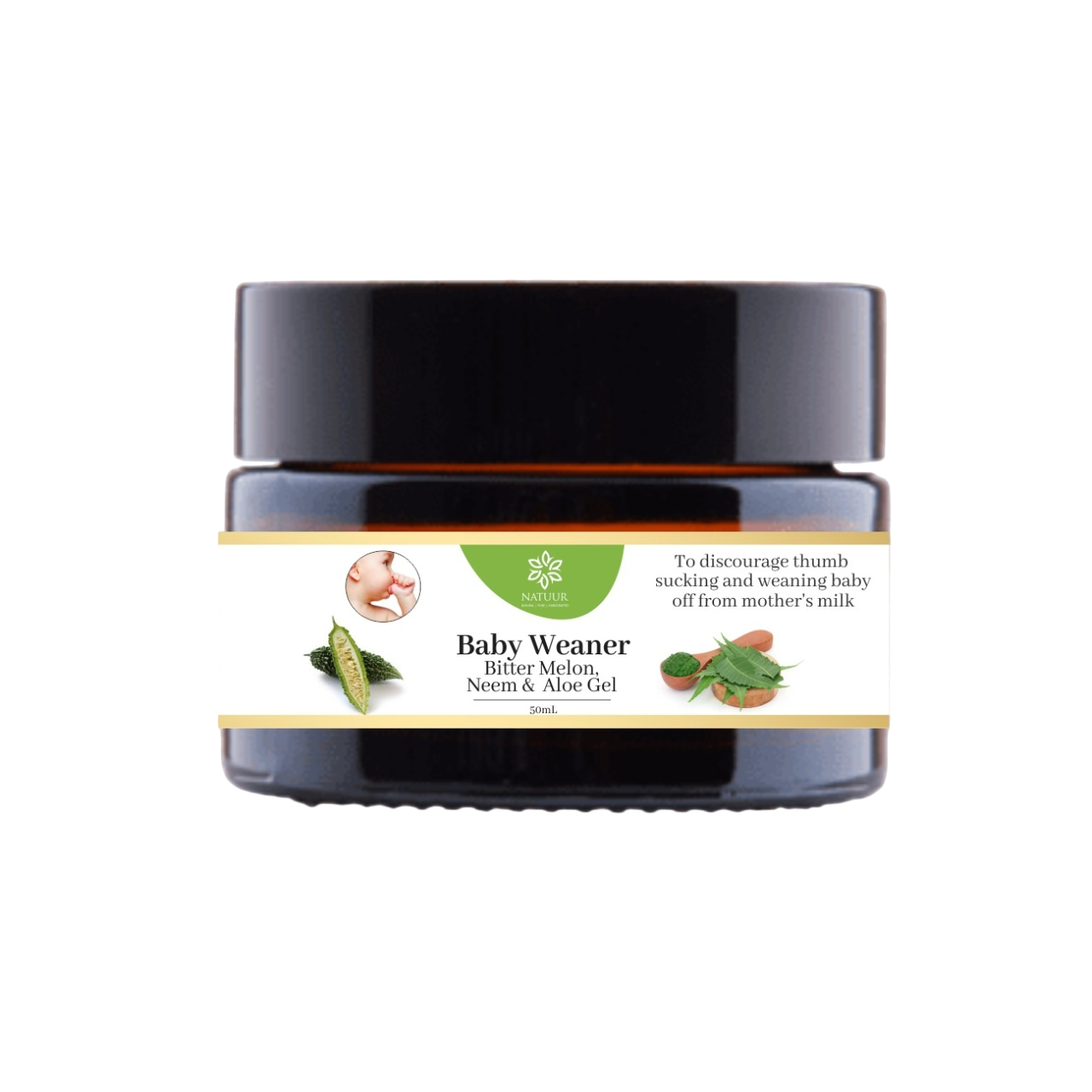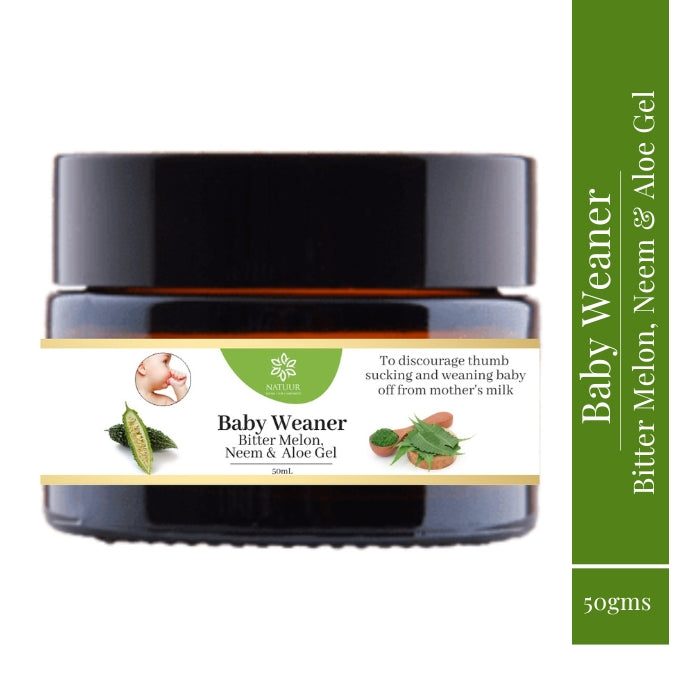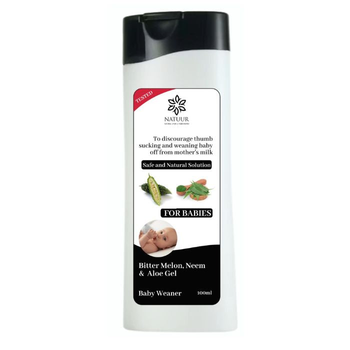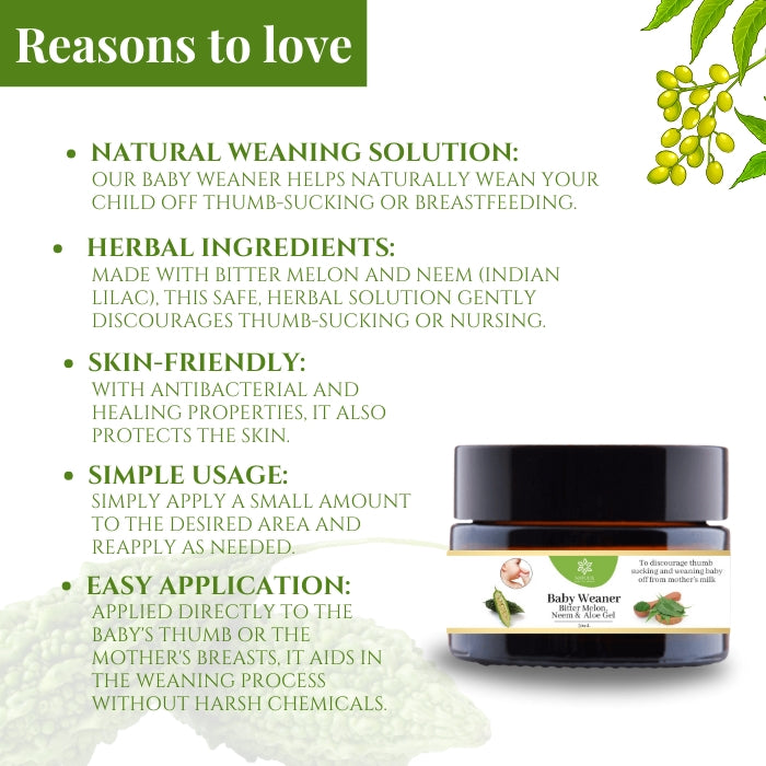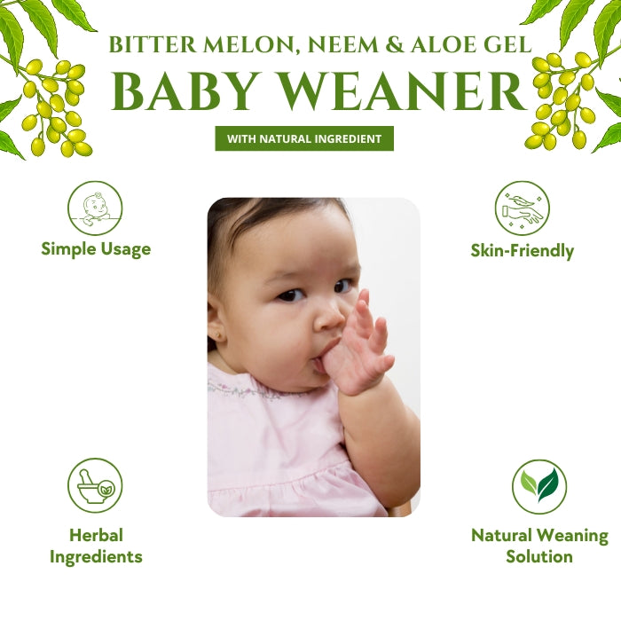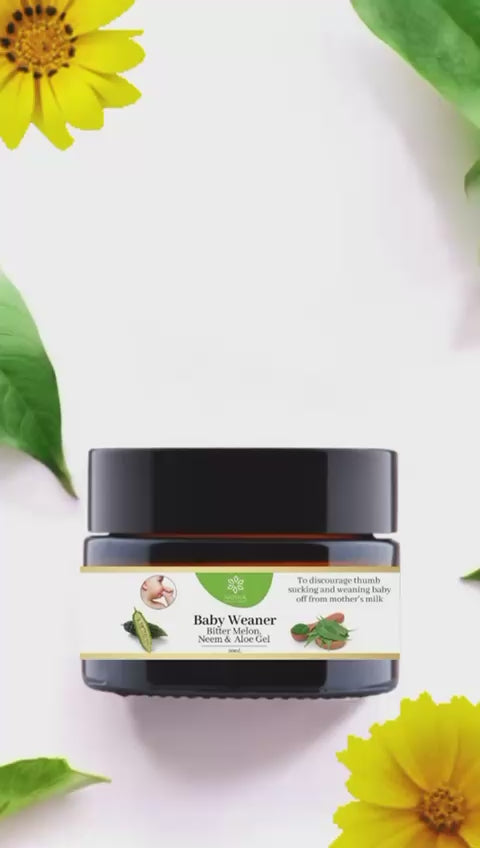 Our Baby Weaner helps naturally wean your child off thumb-sucking or breastfeeding. Made with bitter melon and neem (Indian lilac), this safe, herbal solution is applied directly to the baby’s thumb or the mother’s breasts. The bitter taste gently discourages thumb-sucking or nursing, aiding in the weaning process without harsh chemicals. With antibacterial and healing properties, it also protects the skin. Simply apply a small amount to the desired area and reapply as needed. Ideal for parents seeking a natural weaning solution.