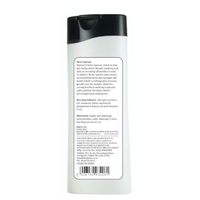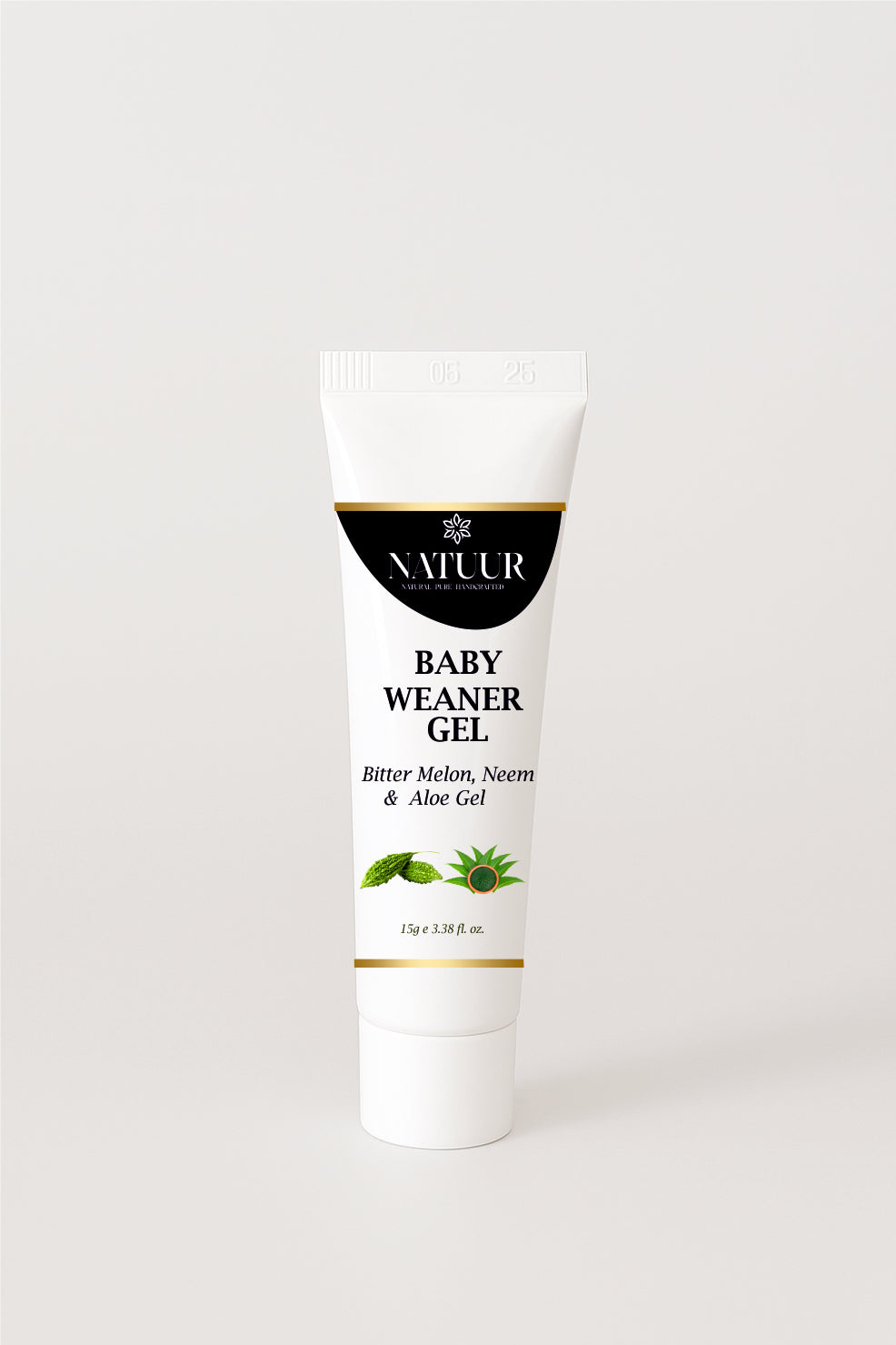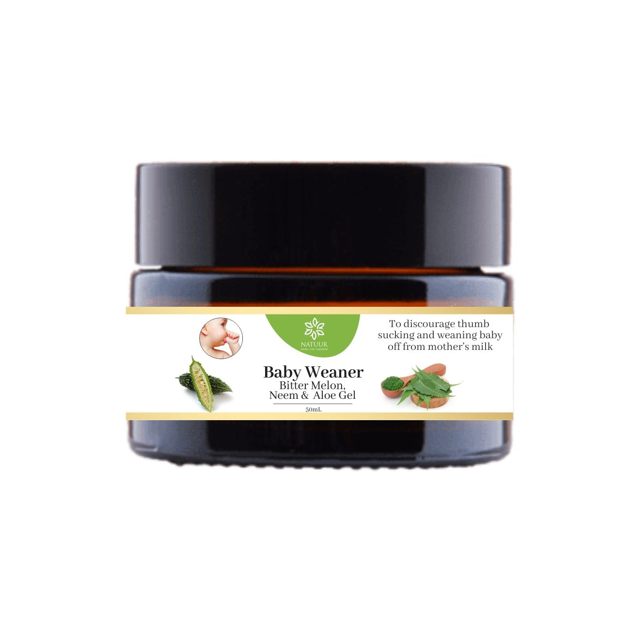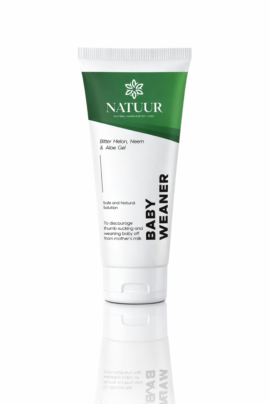 Our Baby Weaner helps naturally wean your child off thumb-sucking or breastfeeding. Made with bitter melon and neem (Indian lilac), this safe, herbal solution is applied directly to the baby’s thumb or the mother’s breasts. The bitter taste gently discourages thumb-sucking or nursing, aiding in the weaning process without harsh chemicals. With antibacterial and healing properties, it also protects the skin. Simply apply a small amount to the desired area and reapply as needed. Ideal for parents seeking a natural weaning solution.