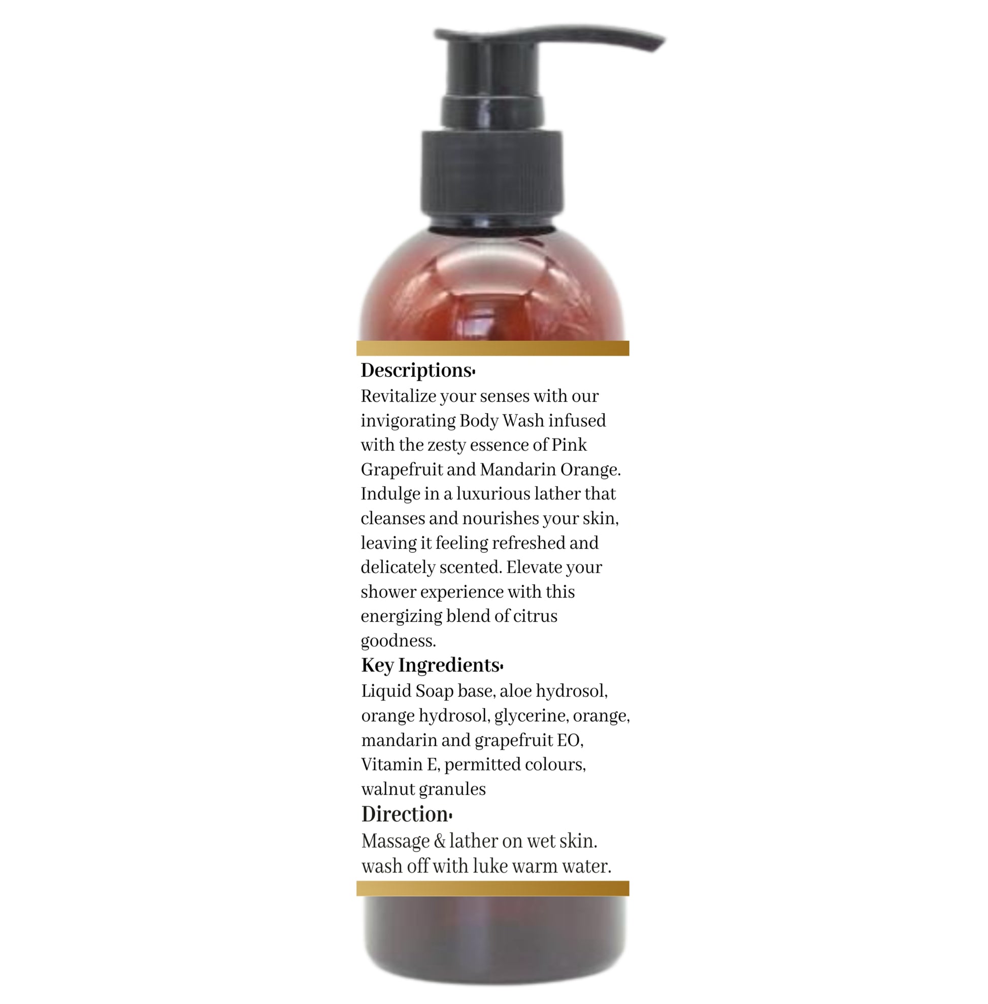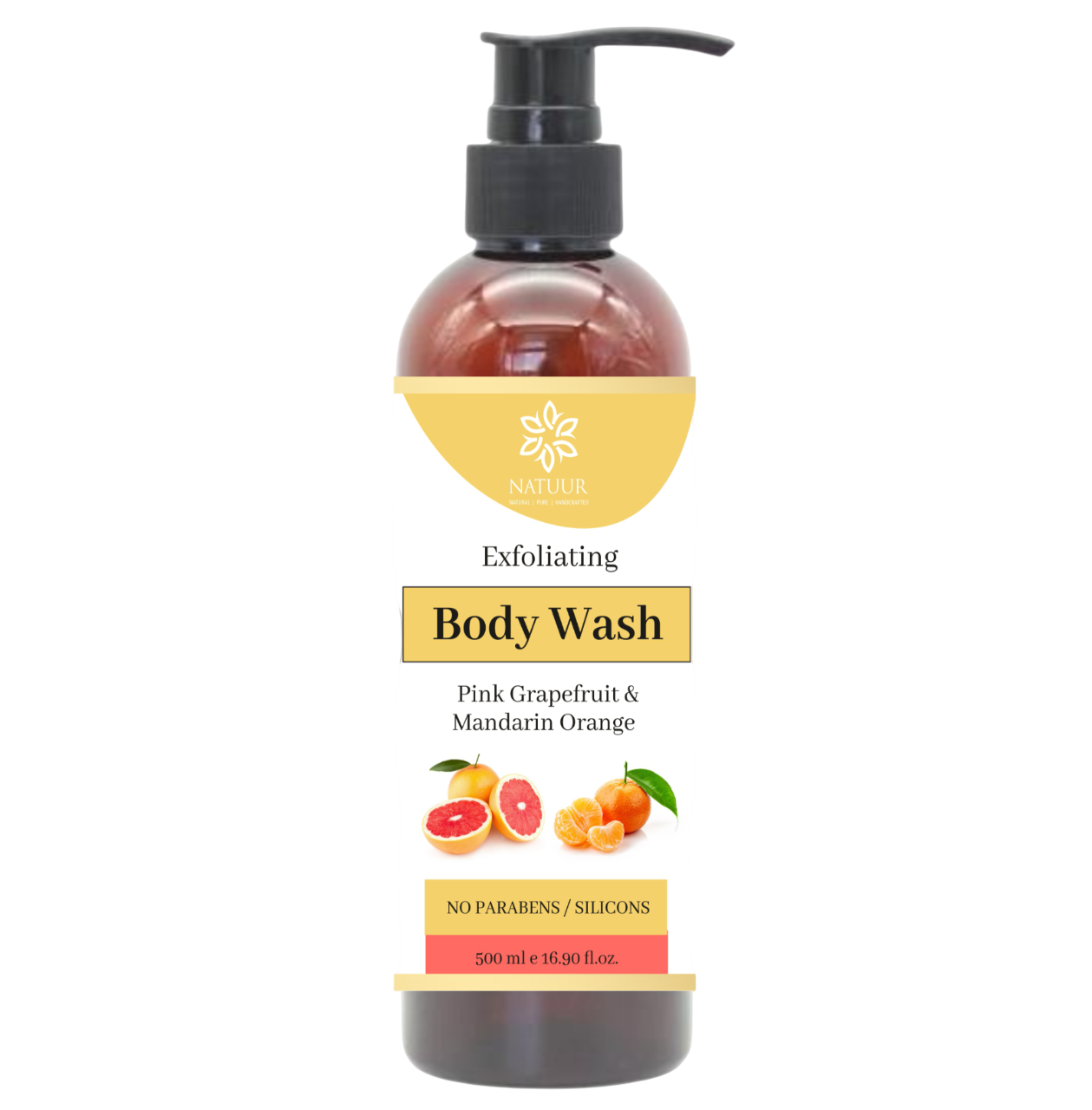 Natuur exfoliating body wash infused with grapefruit, mandarin, and orange essential oils offers a revitalizing experience with multiple benefits. The gentle exfoliation provided by walnut scrub granules buffs away dead skin cells, leaving the skin smoother and softer. The invigorating citrus aroma uplifts the senses and boosts mood. Additionally, the antioxidant properties of these essential oils help to promote healthy skin, improve circulation, and rejuvenate the complexion, leaving you feeling refreshed, energized, and ready to take on the day.
