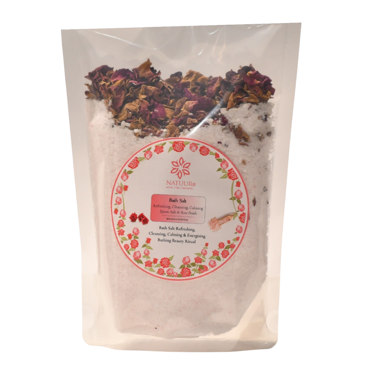 Natuur bath salt infused with Epsom salt and rose geranium essential oils provides a luxurious bathing experience with numerous benefits. The blend of magnesium sulfate and essential oils offers relaxation, relieving muscle tension and promoting a sense of tranquility. Himalayan salt contains minerals like magnesium, potassium, and calcium, which can help to exfoliate dead skin cells, cleanse pores, and improve circulation. Baking soda has natural antibacterial and antifungal properties, making it effective in reducing inflammation. Rose oil moisturizes and nourishes the skin, while geranium oil balances oil production and improves skin tone. Together, they create a calming and rejuvenating bath that soothes the senses, leaving you with soft, radiant skin and a peaceful mind.