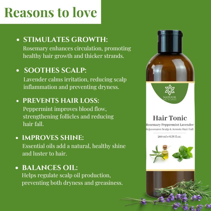 Natuur Hair Tonic is a refreshing, all-natural product that contains rosemary, peppermint, tea tree, rose water, and lavender to rejuvenate your scalp and arrest hair fall. This Hair Tonic is made with premium quality ingredients, including Rosemary hydrosol, which helps to moisturize and restore the pH balance of the scalp, and Lavender hydrosol, which has a calming effect. The Tea tree hydrosol helps to treat dandruff, itchy scalp and makes your hair healthy and moisturized. This Hair Tonic is a natural alternative to chemical hair products and is perfect for all hair types, including color-treated hair. Use this Hair Tonic regularly to get the benefits of these ingredients. Natuur Hair Tonic is 100% natural and does not contain any harsh chemicals or synthetic fragrances. It is safe and gentle to use, and is free from SLS, Parabens, Palm Oil, Color, GMOs, Silicones, Harsh Detergents, and Sulfates. With regular use, Natuur Hair Tonic will make your hair more manageable, softer, and rejuvenate your scalp. Give your hair the care it deserves with Natuur Hair Tonic.