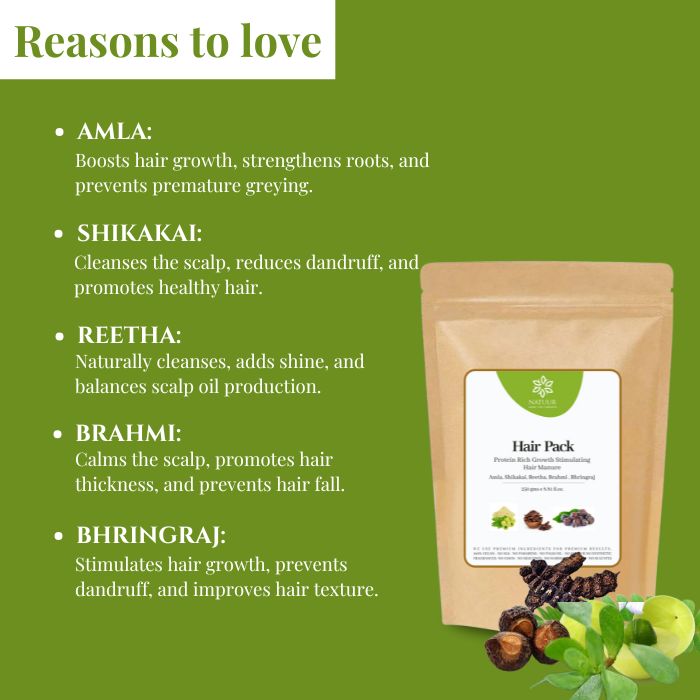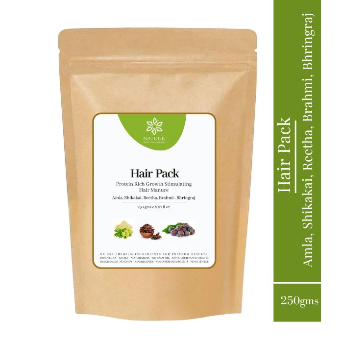 Natuur Hair Pack Protein for hair growth is a potent blend of natural powders crafted to nourish and strengthen hair, promoting exceptional purity and effectiveness. Enriched with amla, shikakai, reetha, hibiscus, fenugreek, brahmi, bhringraj, neem, and green gram powders, each ingredient is renowned for its beneficial properties.