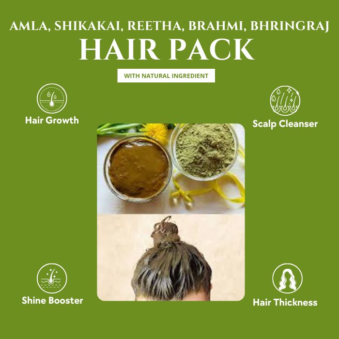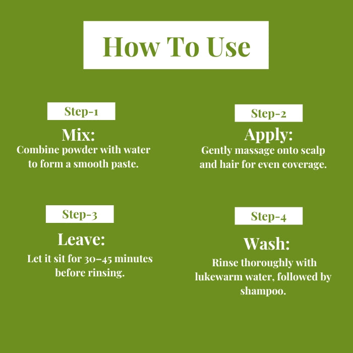 Amla and shikakai cleanse the scalp and promote hair growth, while reetha acts as a natural cleanser. Hibiscus and fenugreek provide conditioning and shine, enhancing hair texture. Brahmi and bhringraj strengthen roots and prevent hair loss, while neem offers antibacterial benefits for scalp health. Green gram powder nourishes hair follicles, encouraging growth.
