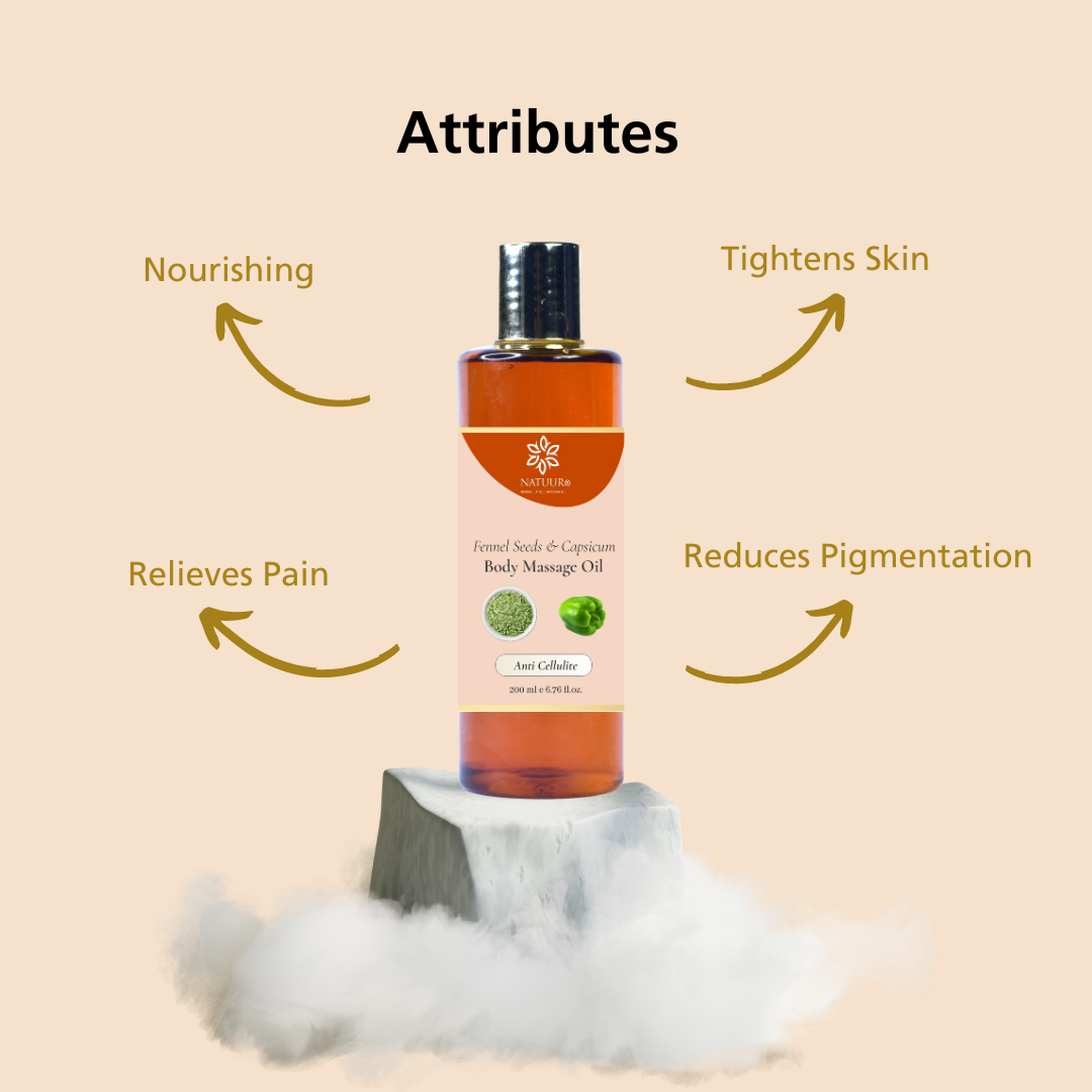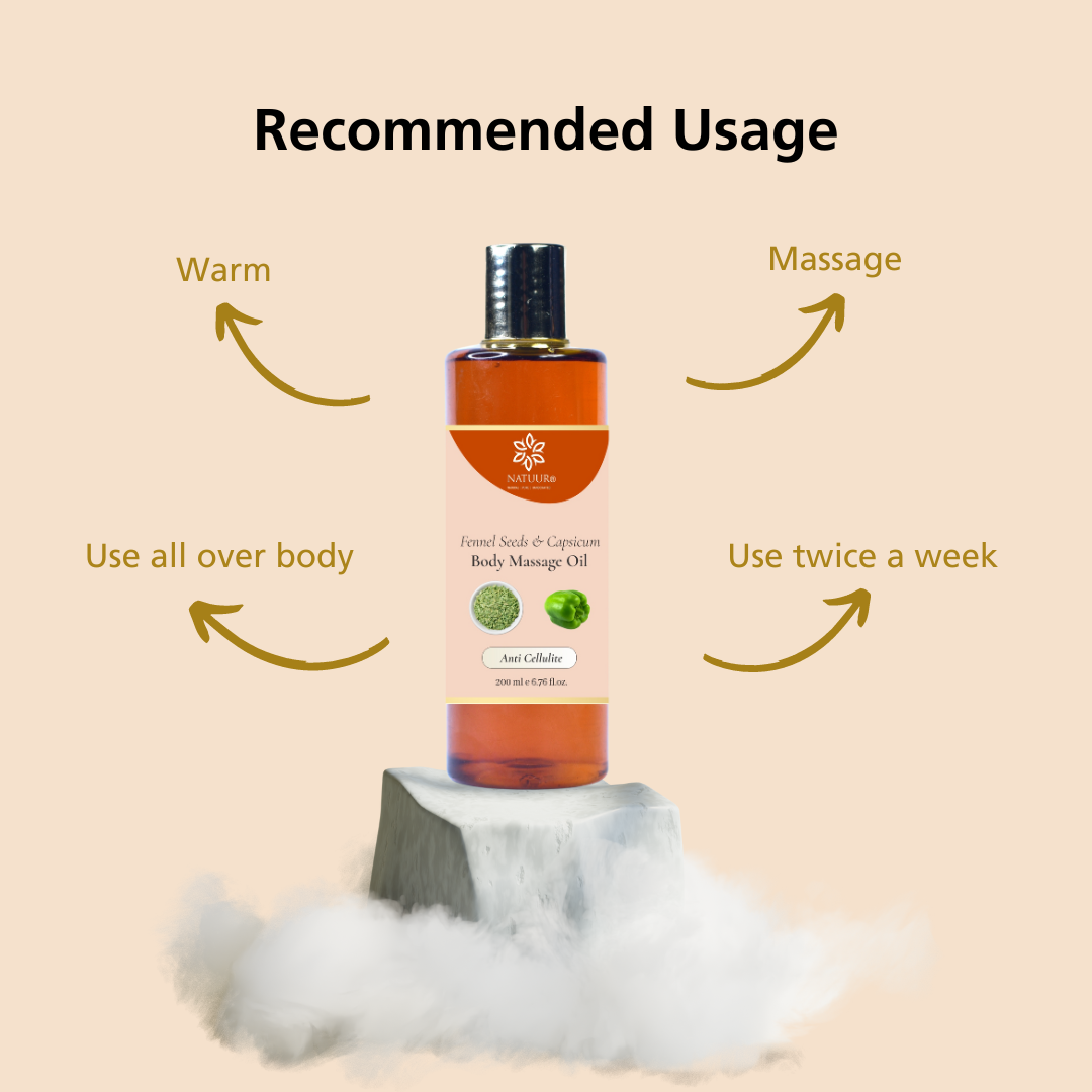 Trust in our premium quality ingredients to deliver the best results for your skin. Choose Natuur’s Massage Oil - Fennel Seeds and Capsicum (Anti Cellulite) for a healthier, smoother, and more radiant-looking skin.