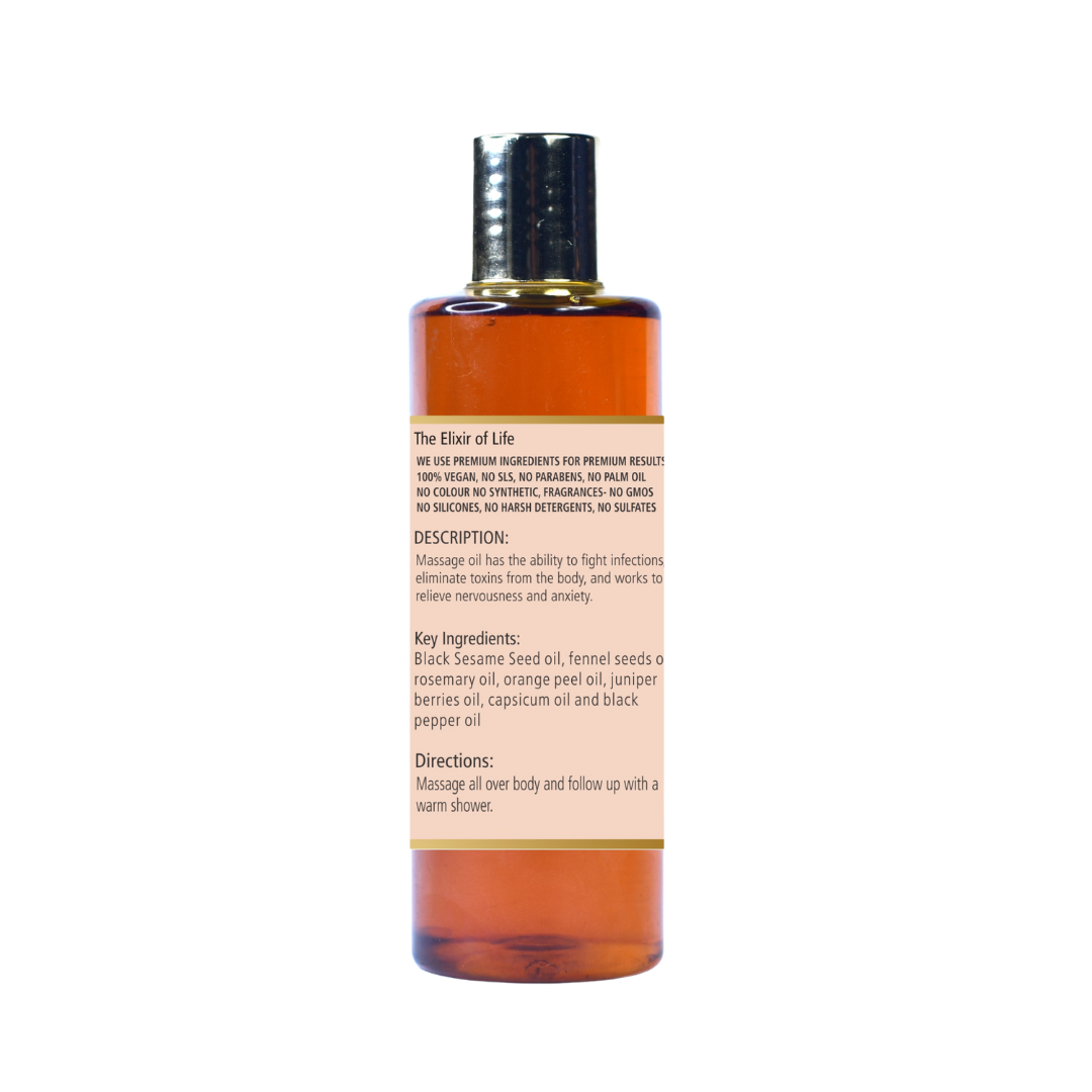 Natuur’s Massage Oil - Fennel Seeds and Capsicum (Anti Cellulite) is a powerful all-natural formula for reducing the appearance of cellulite. Our unique blend of Black Sesame Seed oil, Fennel Seeds oil, Rosemary oil, Orange Peel oil, Juniper Berries oil, Capsicum oil, and Black Pepper oil helps to balance the skin's pH level and stimulate circulation, resulting in smoother and firmer-looking skin.