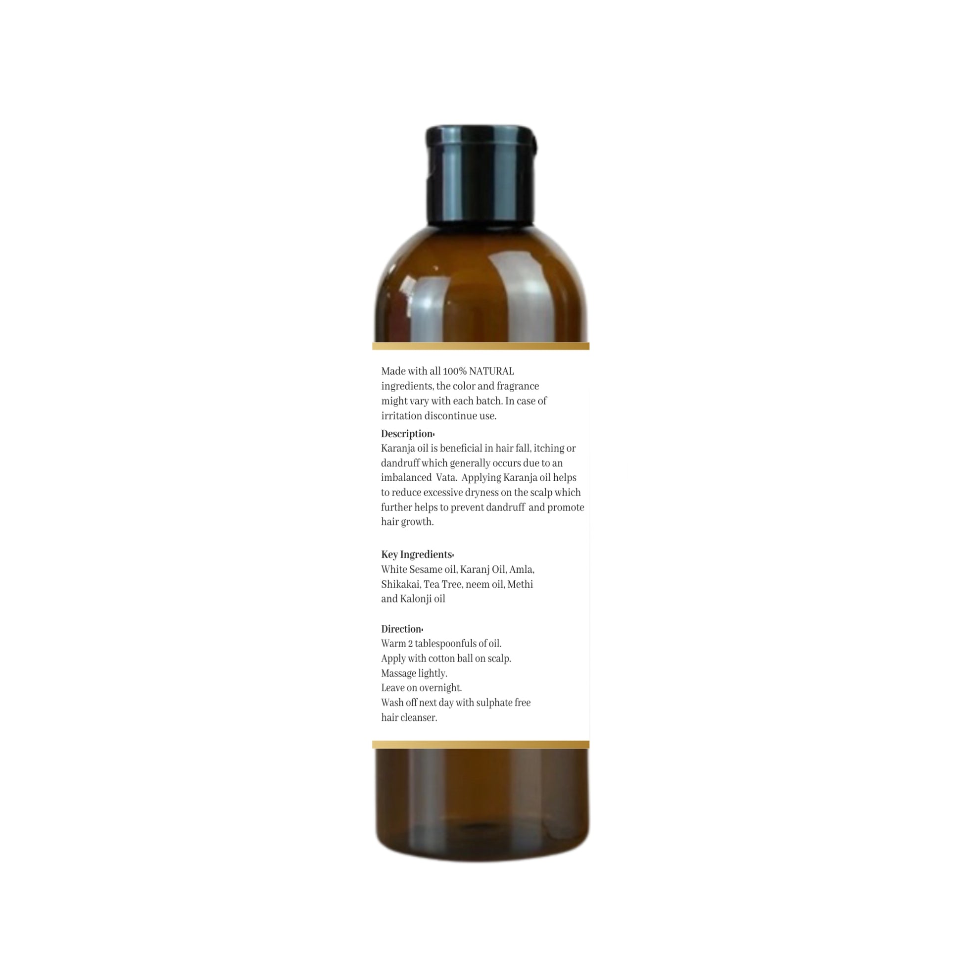 White Sesame oil 45%, Karanj Oil 45%, Amla 2%, Shikakai 2%, Tea Tree 2%, neem oil 2%, Methi 1% and Kalonji oil 1%