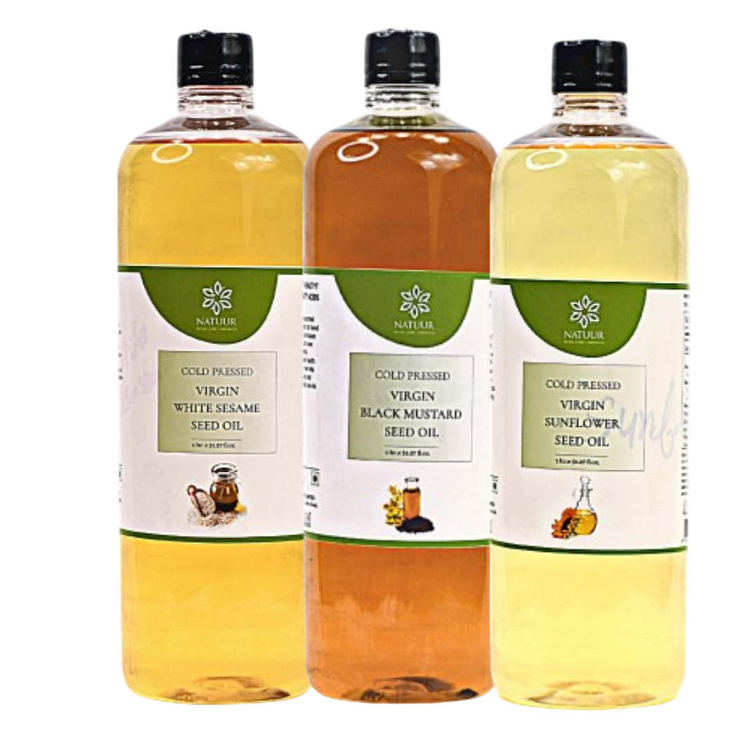 Discover the natural and flavorful goodness of Natuur's Cold Press Edible Oil. This pack of 3, 1 litre oils includes White Sesame, Black Mustard, and Sunflower, perfect for daily cooking. Made with 100% purity and no added chemicals, it's a healthy and delicious choice for your meals.