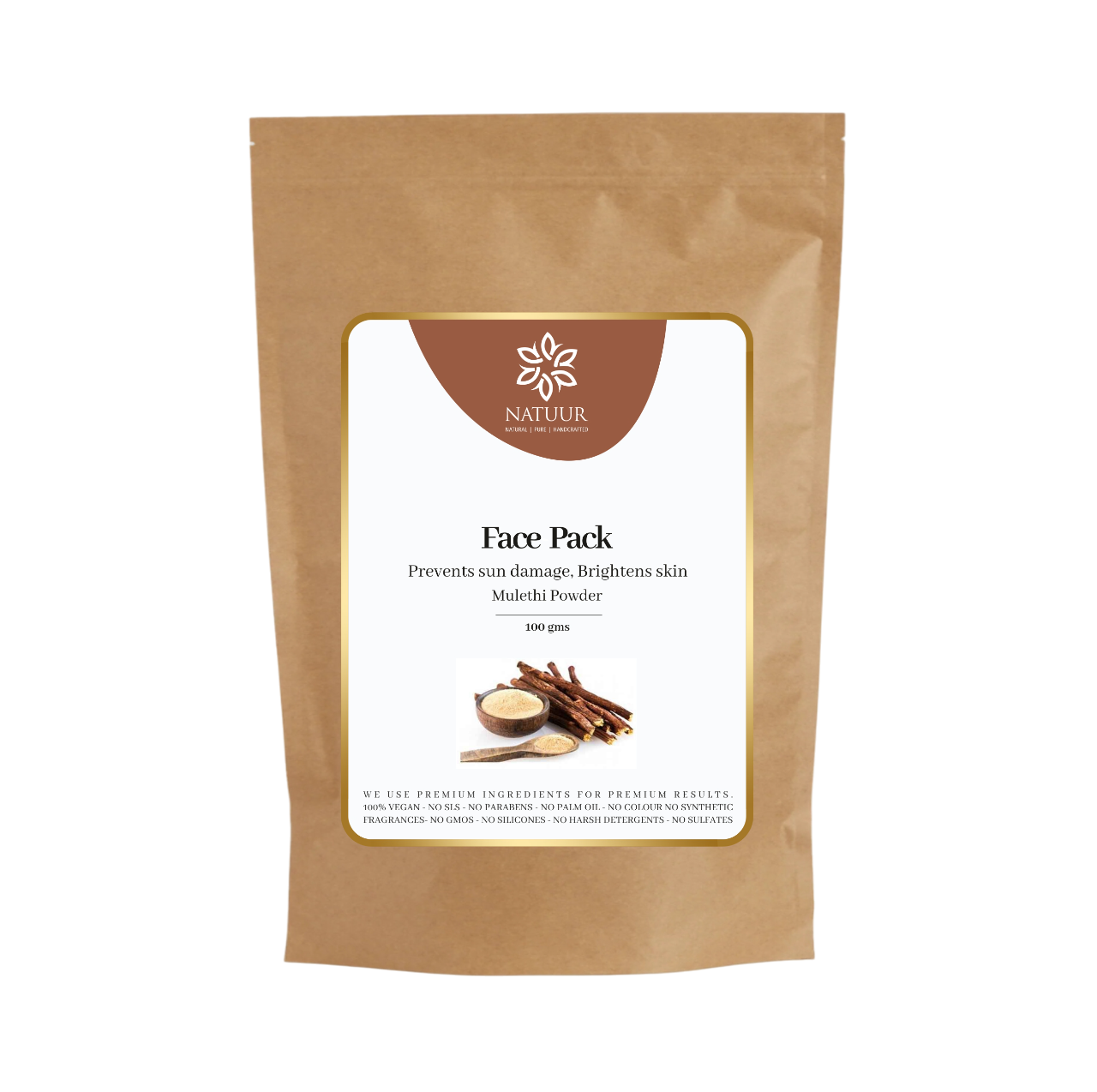 Mulethi, also known as licorice powder, is a popular ingredient in ayurvedic medicine for treating certain ailments. It is an emollient that helps maintain skin health and has skin whitening properties. This powder can help reduce tan, dirt, impurities from your skin, remove dull skin, and give you a radiant, glowing complexion.