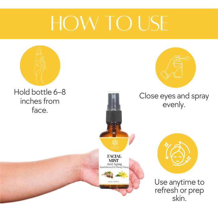 Natuur's Facial Mist made with goodness of Sandalwood and Ylang ylang is the best soothing solution for the anti aging skin. Sandalwood and Ylang ylang in it are the most beneficial ingredients recognized for its aroma as well as its exquisite healing qualities. It nourishes tired and dull skin with a gentle and refreshing Sandalwood & Ylang ylang face mist. This organic formula also helps reduce acne and early signs of ageing. Sandalwood retains moisture levels, tones, purifies, cools and soothes and ylang ylang is detoxifying and cooling. For best results use on slightly damp skin just after a bath or shower.