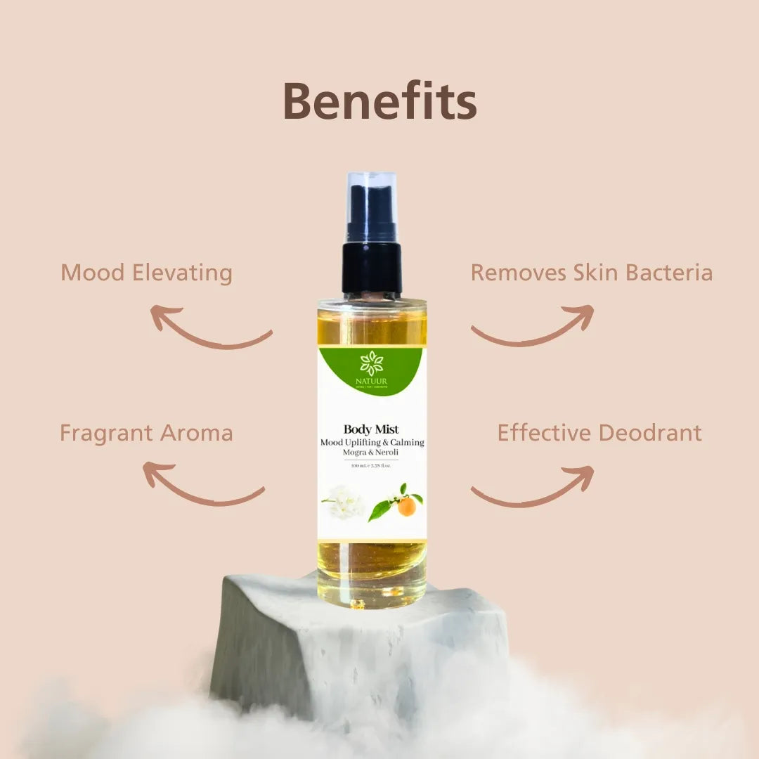 We love this fragrance because it’s light and subtle but packs a punch. Natuur Body Mist - Mogra and Neroli - Floral - Mood Uplifting & Calming is made with 100% natural fragrance oils and is suitable for all skin types. The intoxicating scent of mogra and neroli combined to create a delicate, sweet floral aroma. This fragrance is sure to capture the heart of anyone in your vicinity. The sweet, floral scent is the perfect fragrance for the springtime. This is a delicate, sweet floral fragrance that is sure to capture the heart of anyone in your vicinity. This fragrance is perfect for the springtime. Ideal for use after a workout or when you need a pick-me-up. Our rich and floral body mist provides the perfect moisture for the skin without feeling sticky or heavy. The all-natural ingredients include a high percentage of organic ingredients. Organic Mogra and Neroli Body Mist is a fragrance for those who love light floral scents..