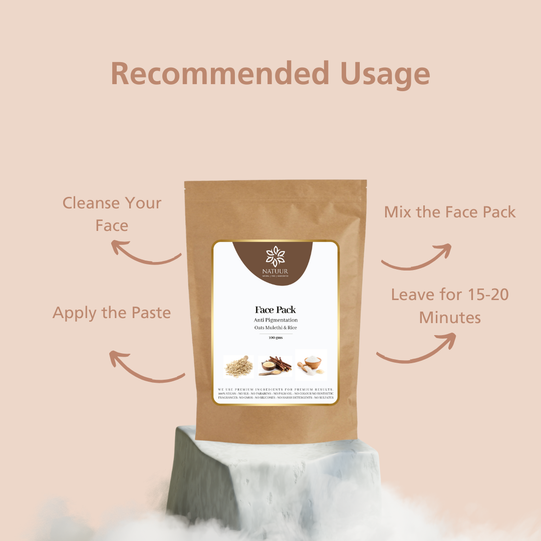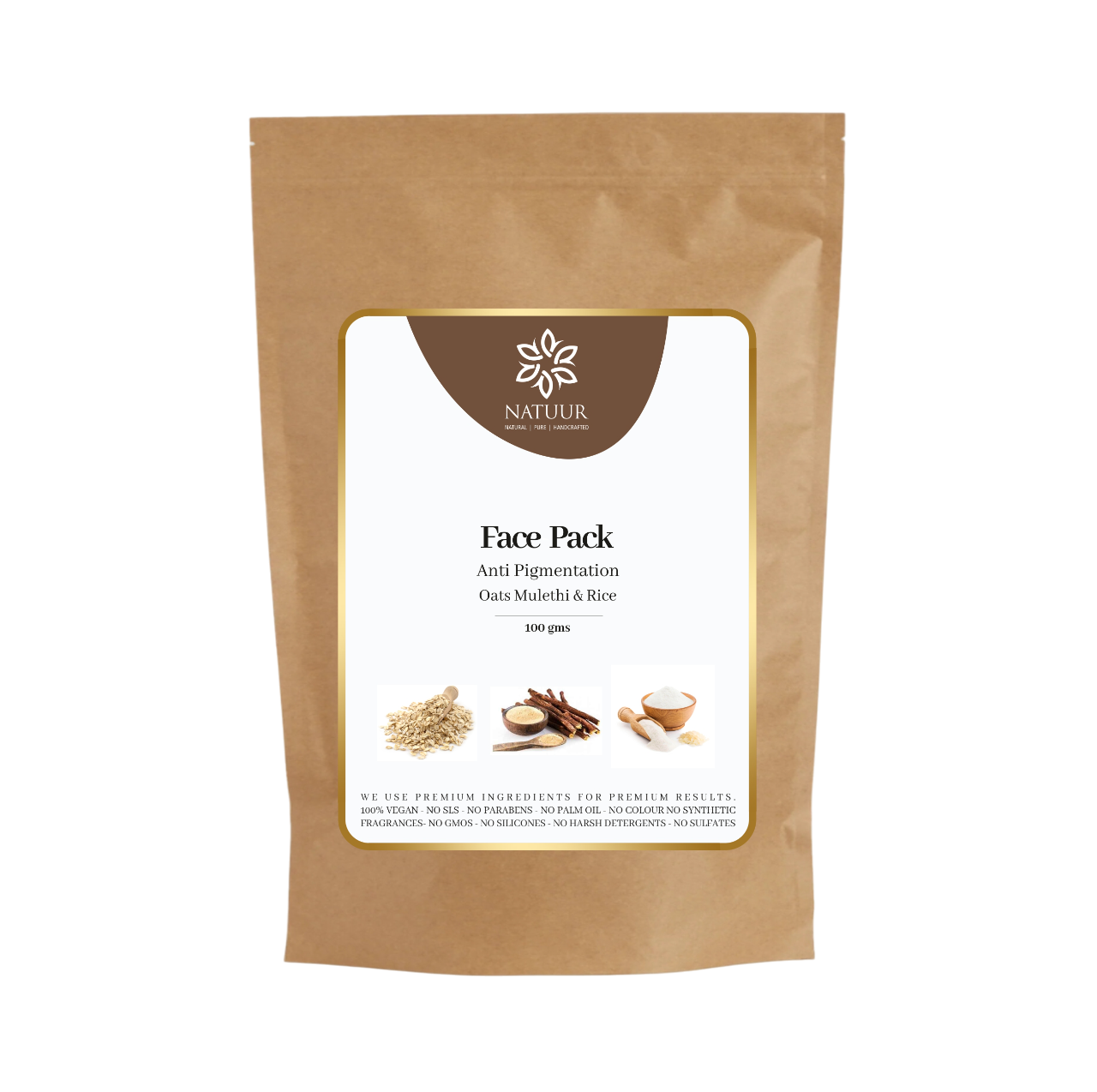 Take a tsp of the powder blend, make a paste with Natuur activation Liquid or rose water for face pack, till you get a desired consistency. Alternatively make the pack with raw milk or curd of choice. Apply all over face and neck areas. Leave on till it dries. Wash off with luke warm water. Follow up with a toner and a moisturiser of choice. Repeat daily for best results.