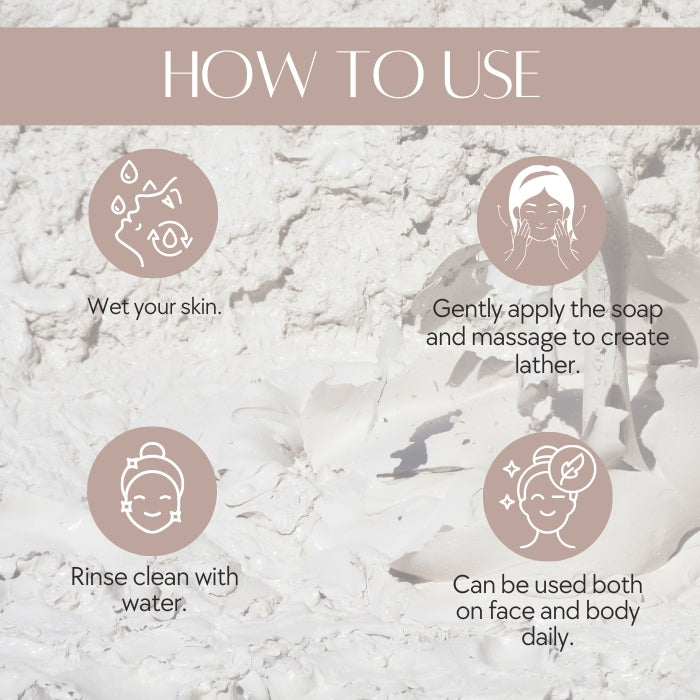 Can be used on both face and body. Wet skin & gently apply the soap to create lather and rinse clean. Store in a cool & dry place.