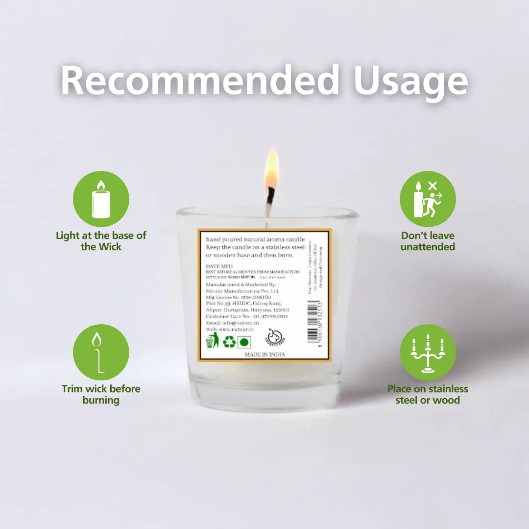 To create this candle, we first warm the beeswax and add virgin coconut oil to it, mixing it well before adding the essential oils. The cotton wick is then placed in the center of the glass jar, and the melted wax blend is poured in. Once cooled, the jar is labeled and ready to burn.