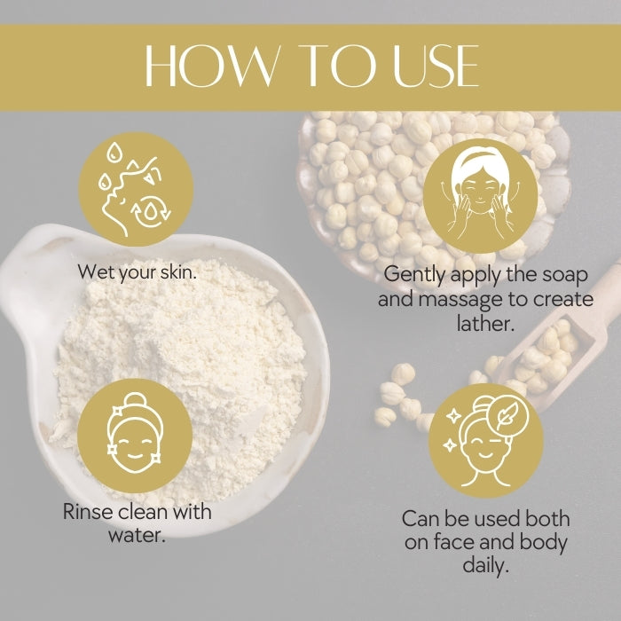 Can be used on both face and body. Wet skin & gently apply the soap to create lather and rinse clean. Store in a cool & dry place.
