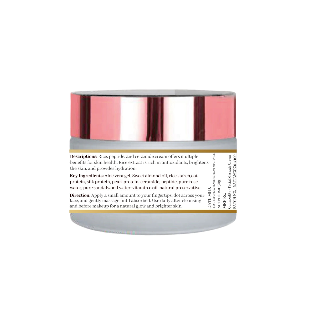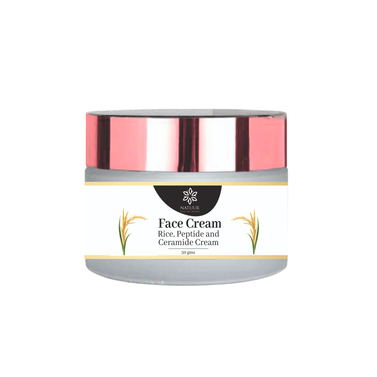 Rice, peptide, and ceramide cream offers multiple benefits for skin health. Rice extract is rich in antioxidants, brightens the skin, and provides hydration. Peptides boost collagen production, improving skin elasticity and reducing fine lines. Ceramides strengthen the skin barrier, locking in moisture and protecting against dryness and environmental damage. Together, they promote a smooth, radiant complexion, repair skin from within, and are ideal for anti-aging, sensitive, or dry skin types seeking nourishment and repair.