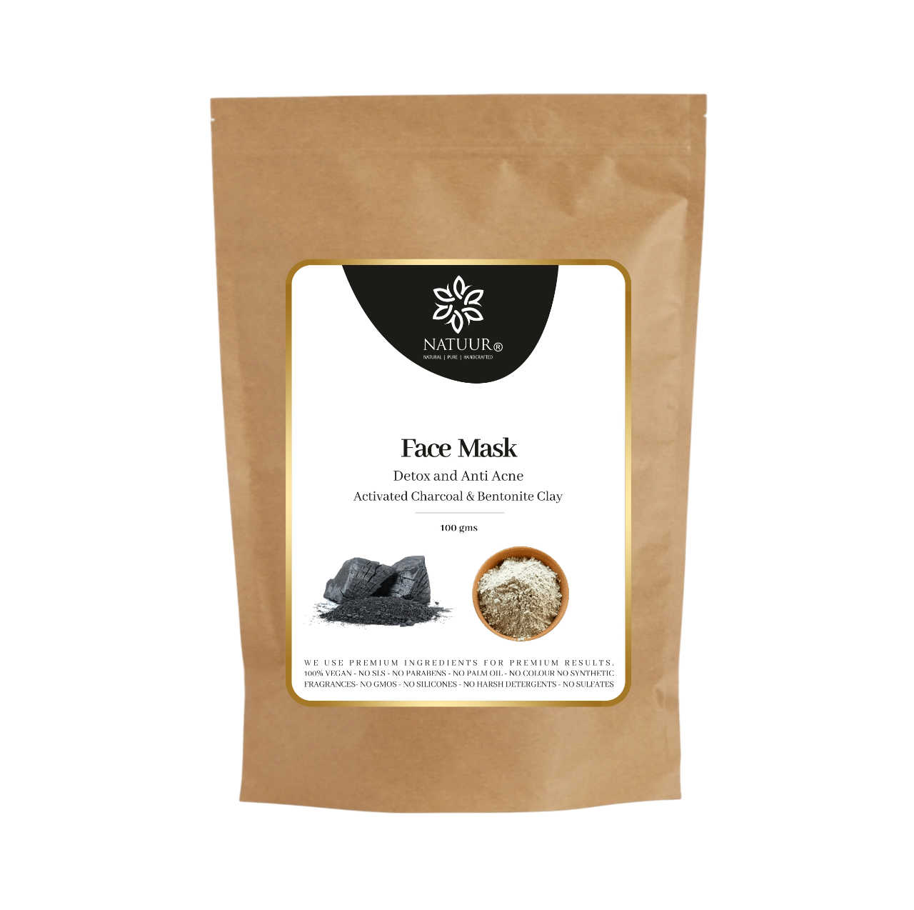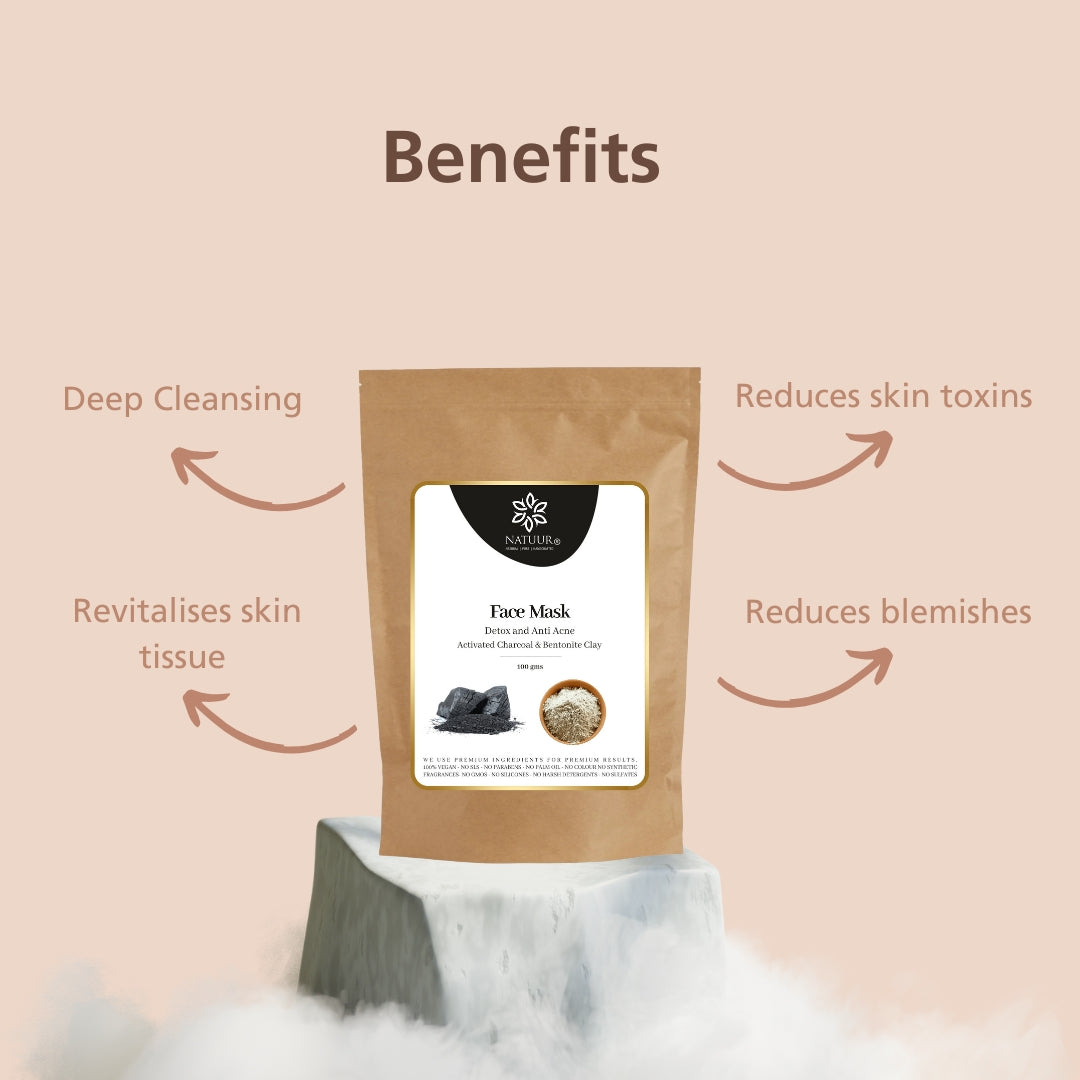 Experience complete damage repair with Natuur's Activated Charcoal & Bentonite Clay Face Mask, designed to detoxify and soothe acne-prone skin. Made with a carefully curated blend of natural ingredients, including Bentonite clay, oatmeal powder, sandalwood powder, ashwagandha, manjishtha powder, orange peel powder, and activated charcoal, this mask provides a hydrating radiance to dull skin. The power of activated charcoal deeply cleanses and unclogs pores, while the addition of Bentonite clay strengthens sagging skin, tightens pores, and balances oil levels for optimum nourishment. Its thick, mousse-like texture makes it easy to apply, and it is suggested to use it twice a week for a healthy, smooth, clean, and clarified complexion. Get ready for clear, smooth, calm, and balanced skin with Natuur's Face Mask.
