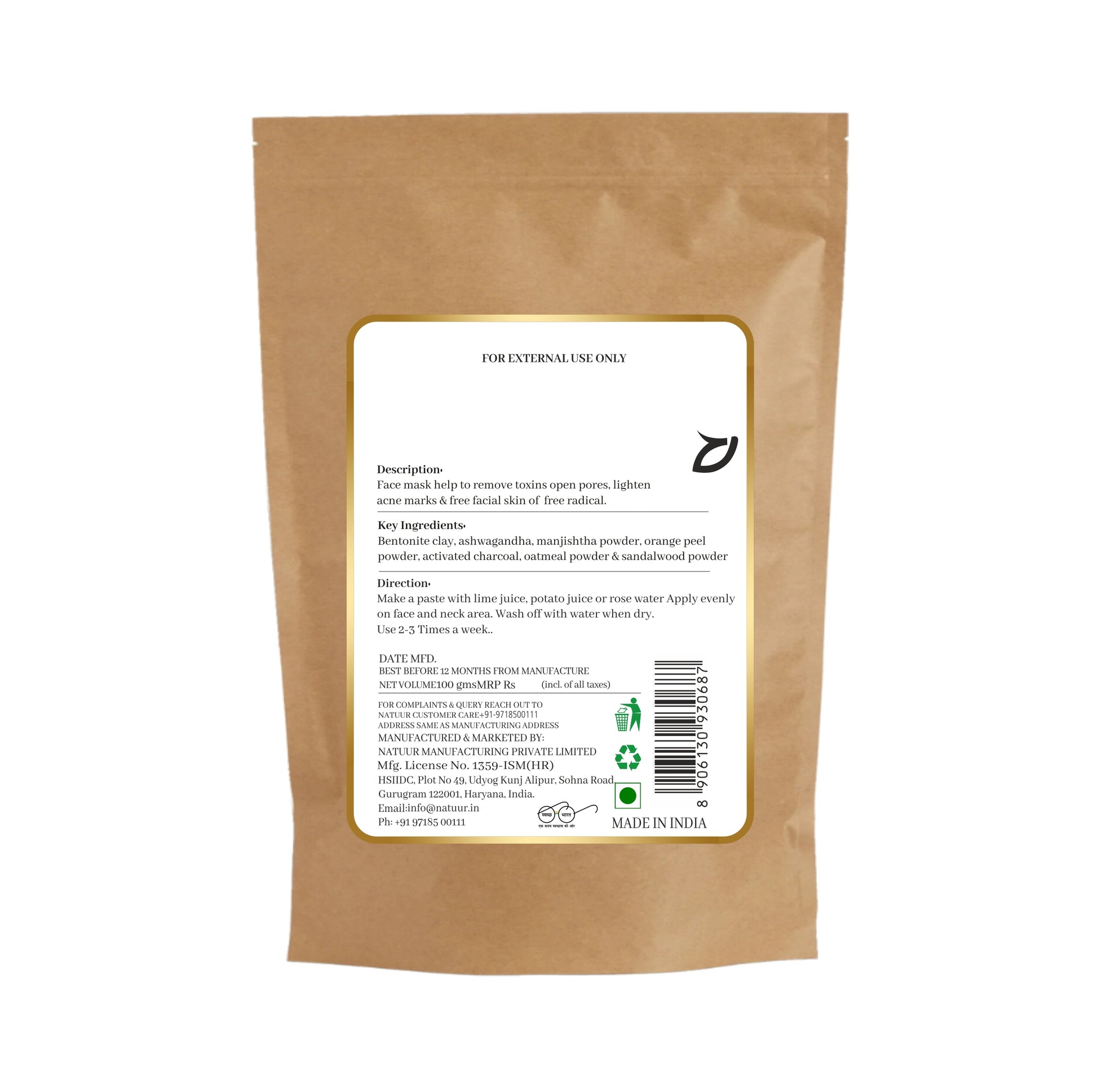 Bentonite clay , oatmeal powder , sandalwood powder , ashwagandha , manjishtha powder , orange peel powder , activated charcoal