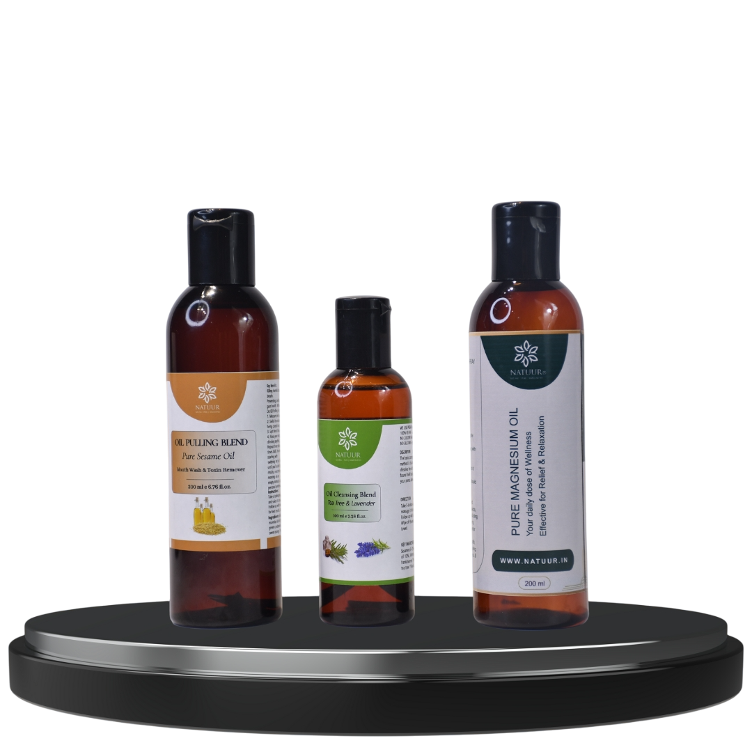 | Sesame Oil pulling blend 200 ml | Natuur Oil Pulling Blend combines sesame oil with fennel seeds, green cardamom, cloves, and cinnamon, offering a natural and effective method for oral detoxification. This blend is meticulously crafted for purity, free from additives and preservatives. Sesame oil serves as a base, known for its antimicrobial properties that help reduce plaque and bacteria in the mouth. Fennel seeds, green cardamom, cloves, and cinnamon provide additional benefits: fennel seeds freshen breath, cardamom and cloves have antibacterial properties, and cinnamon supports oral health with its antimicrobial and anti-inflammatory effects. Incorporating oil pulling into your daily morning routine before brushing helps detoxify the mouth, removing toxins and promoting healthier gums and teeth. This ancient practice not only enhances oral hygiene but also supports overall well-being by maintaining a clean and balanced oral environment naturally. |