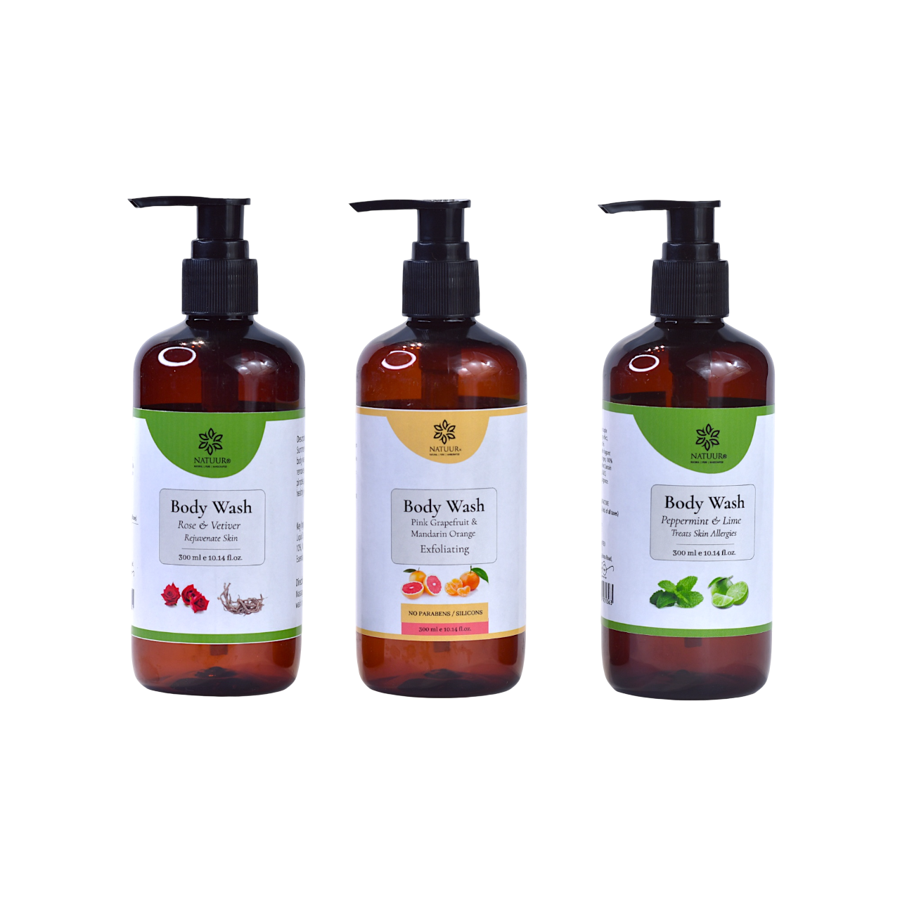 Introducing Natuur's Luxurious Body Wash Set, a trio of indulgent scents to elevate your bathing experience. Each 300ml bottle is a blend of natural ingredients, meticulously crafted to cleanse, nourish, and invigorate your skin. Immerse yourself in the captivating aroma of Rose Vetiver, a floral symphony that soothes and rejuvenates. Energize your senses with the vibrant fusion of Grapefruit Mandarin, leaving you feeling refreshed and revitalized. Or, embrace the cooling sensation of Peppermint Lime, perfect for awakening your senses and providing a burst of freshness. Transform your daily shower routine into a spa-like escape with this exquisite collection of body washes, designed to leave your skin feeling soft, smooth, and delicately fragrant.