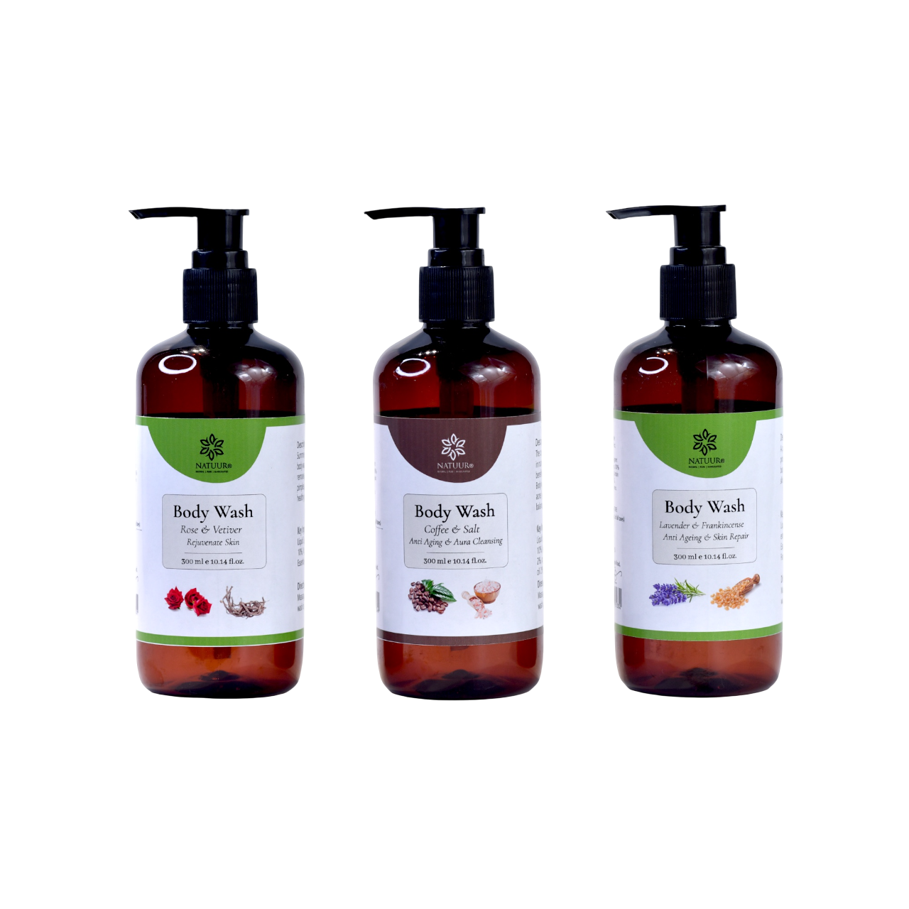 Introducing Natuur's indulgent Body Washes Set, a trifecta of luxurious scents designed to elevate your bathing ritual. Each 300ml bottle is a sensorial journey, meticulously crafted to cleanse, rejuvenate, and nourish your skin. Immerse yourself in the delicate allure of Rose Vetiver, enveloping your senses in a floral embrace that soothes and revitalizes. Awaken your spirit with the invigorating blend of Coffee Salt, offering gentle exfoliation and a rich, aromatic experience. Or indulge in the calming aroma of Frankincense Lavender, soothing both body and mind with its tranquil fragrance. Transform your daily shower into a spa-like escape with this exquisite collection, leaving your skin feeling refreshed, renewed, and delicately scented.