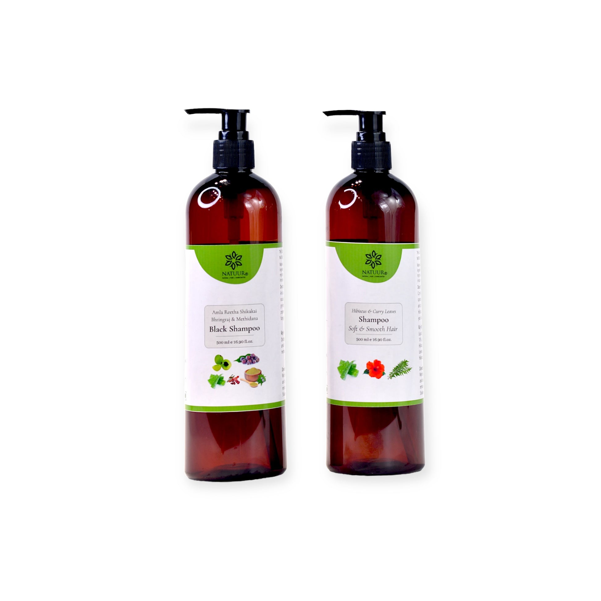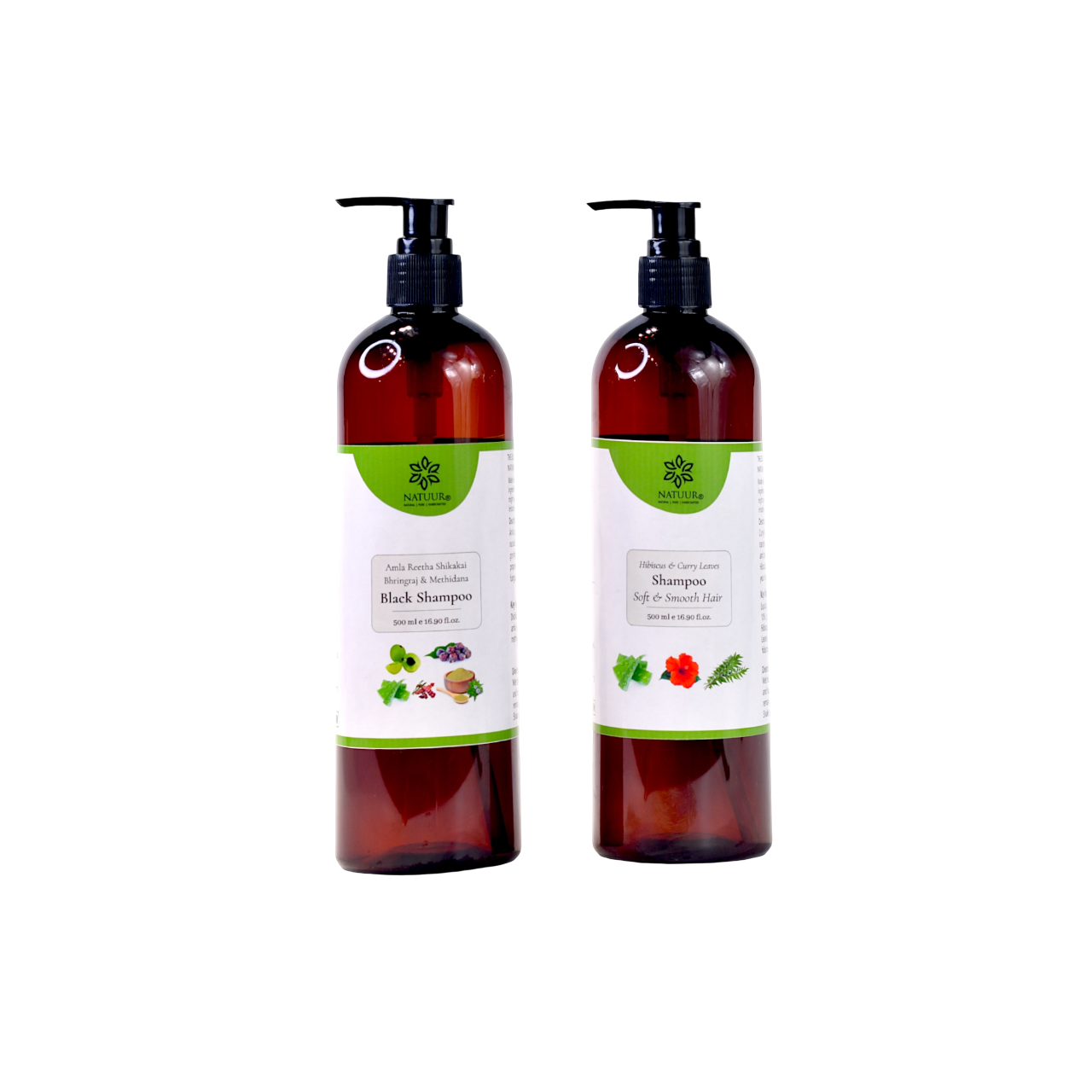Introducing Natuur's Hair Care Power Duo, a dynamic Shampoo Set designed to nurture and fortify your locks with potent natural ingredients. Each 500ml bottle is a blend of nature's treasures, carefully selected to promote hair health and vitality. Dive into the enriching benefits of Black Shampoo infused with amla, shikakai, methi, reetha, hibiscus, jatamasi, brahmi, and bhringraj, a traditional Ayurvedic blend known for its rejuvenating properties, promoting strength and shine. Then, indulge in the nourishing Aloe Hibiscus Curry Leaves Shampoo, combining the soothing properties of aloe with the scalp-stimulating benefits of hibiscus and curry leaves for hair that's revitalized, voluminous, and irresistibly vibrant. Elevate your hair care routine with this powerhouse duo, and unlock the secret to beautifully nourished locks, naturally.