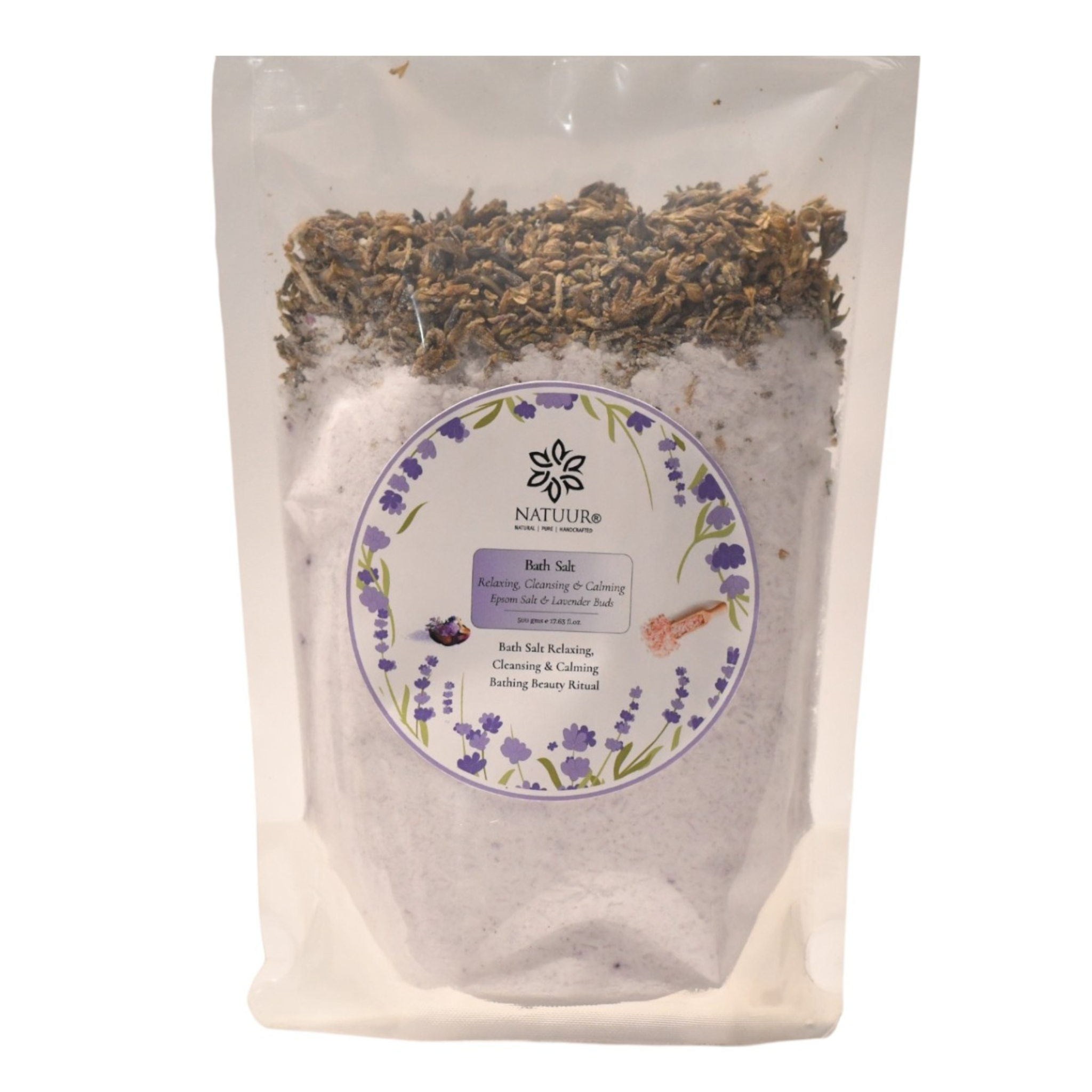 Natuur Lavender bath salt offers a luxurious and pure bathing experience, crafted with premium-grade Epsom salt, baking soda, Himalayan salt, lavender essential oil, and dried lavender buds. This blend ensures exceptional purity, free from additives and chemicals.