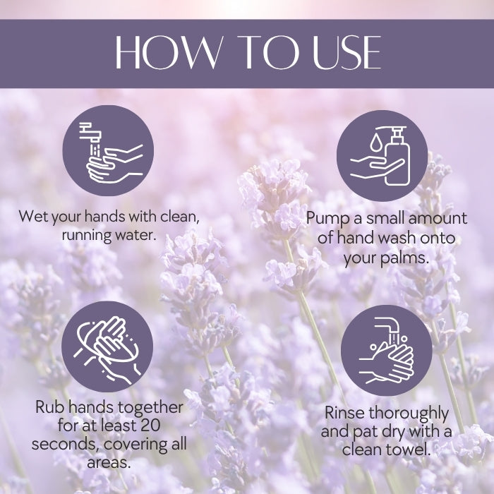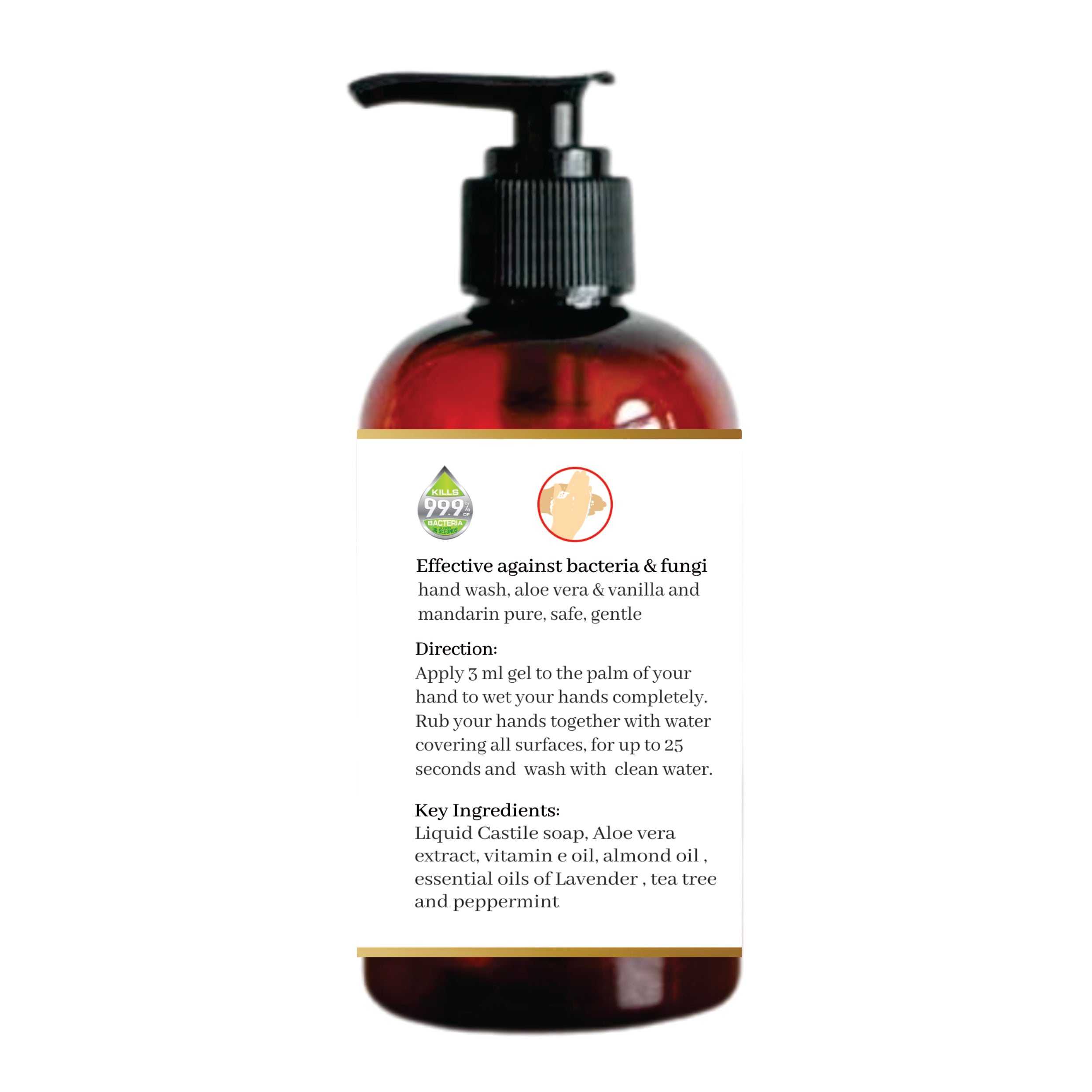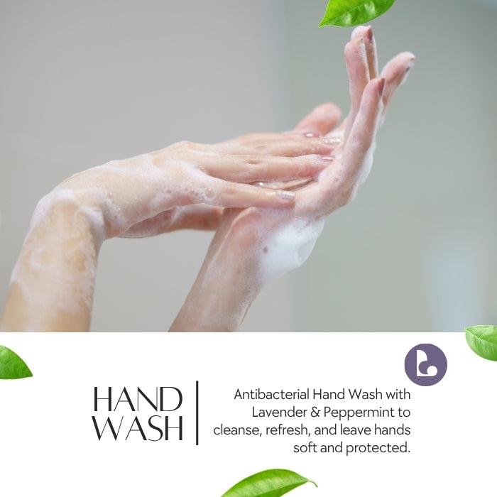 Our hand wash provides antibacterial properties and cleanses your hands gently and effectively. It is infused with a heavenly burst of lavender and peppermint that feels like you are hit with a strong burst of fragrances and freshness - both at once. The hand wash is made with natural ingredients, including Aloe Vera extracts, that provide nourishment to the skin and keep your hands feeling touchably soft and smooth after every wash.