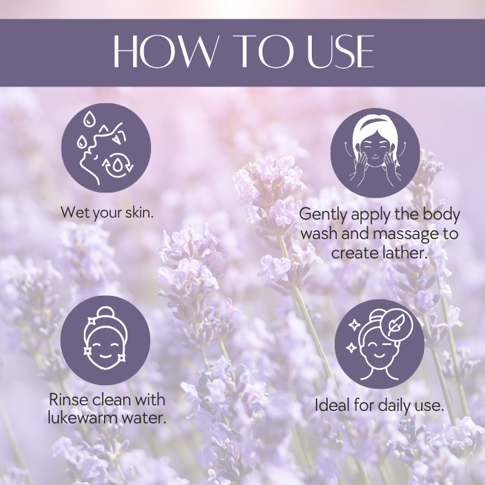 The body wash is easy to use, simply massage and lather on wet skin and wash off with water. The lavender and frankincense scents are calming and refreshing, leaving you feeling relaxed and rejuvenated. This body wash is a great way to cleanse and nourish your skin while also providing anti-aging benefits. It is a gentle cleanser that won't leave your skin feeling dry or tight.