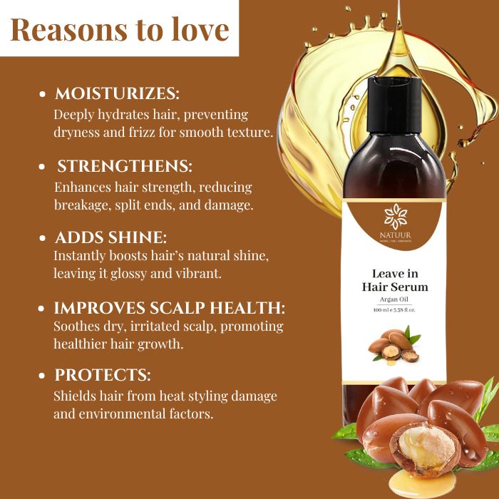 Natuur leave-in hair serum- argan oil is a moisturizing hair serum that penetrates deep into the hair shaft to nourish the hair from the inside out. It's a natural hair serum that can add moisture to dry hair or add a natural shine to hair. This hair serum is lightweight and does not leave a greasy residue. It can be used on wet or dry hair and all hair types. The product is designed to provide moisture and nourishment to the hair, beneficial for people with dry hair. This is a leave-in hair serum that boosts moisture and restores shine to hair. The product is designed to be used as a serum for dry hair, with the unique benefits of Argan oil. It is easy to use and provides the hair with moisture, nourishment, and protection. It can be used as a deep conditioner, leave-in conditioner, or styling product. It helps to soften the hair and leaves it feeling shiny and smooth.