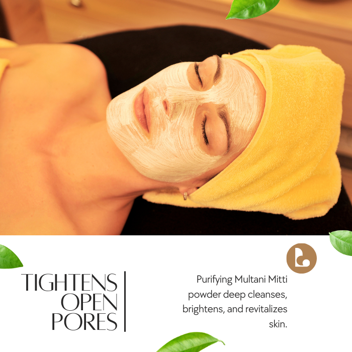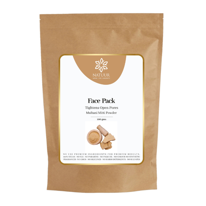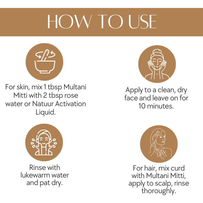 For skin, mix one tablespoon of our Multani Mitti powder with two tablespoons of rose water or natuur activation liquid to make a smooth paste. Apply the paste to a clean, dry face, leave on for 10 minutes, rinse with lukewarm water and pat dry. It helps tighten the skin and stop acne, pimples by eliminating unwanted excess oil from your face.